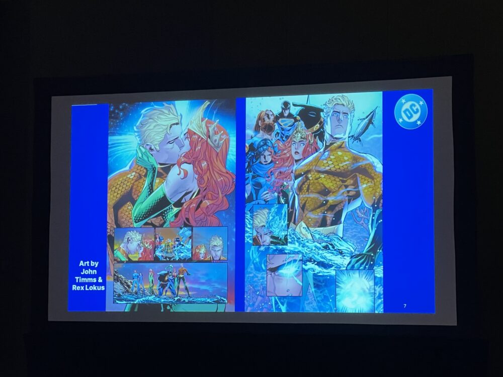 Holzherr joked that Adams’ Aquaman pitch to attendees “went swimmingly” — to lighthearted jeers from the crowd — while pivoting briefly to Adams’ other section of the DC Universe in the recently released Green Lantern #600.