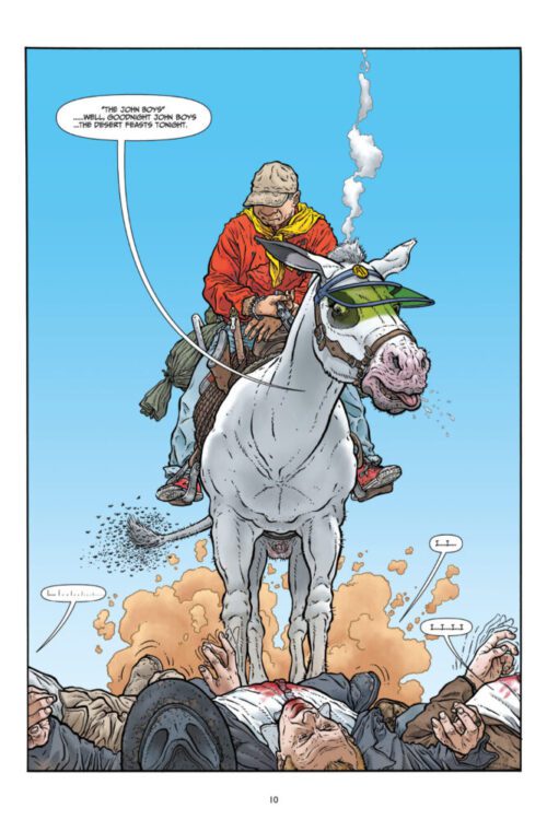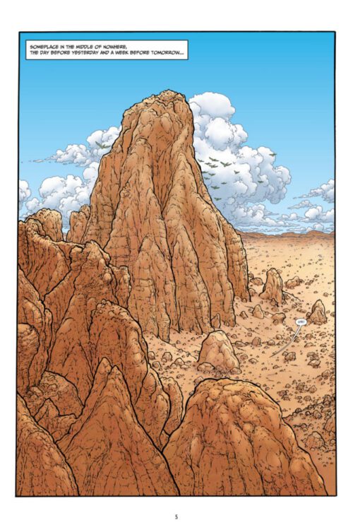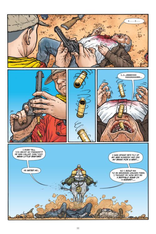 Collected in this special anniversary deluxe hardcover edition are The Shaolin Cowboy: Start Trek and the long out-of-print fan-favorite Bourbon Thret comics from Comics and Stories, originally published in France by Moebius’ publishing house Ædena. What lies ahead are more than two hundred pages where every single panel is a work of art. You can look at these pages for years and always find something new in the details.