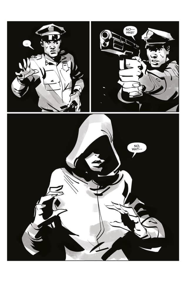 Brian Hawkins: I’m definitely a fan of grayscale. That goes back to The Walking Dead for sure. But the choice for black and white/grayscale for Black Cotton was definitely story-based. We talked about it early, the grittiness of it, and since it is a story about black and white, i.e., “color,” to take color out of it — seemed poetic and right — also, it allows you to focus on the characters and to see them “without color” for who they are through the lens of social order in this universe.