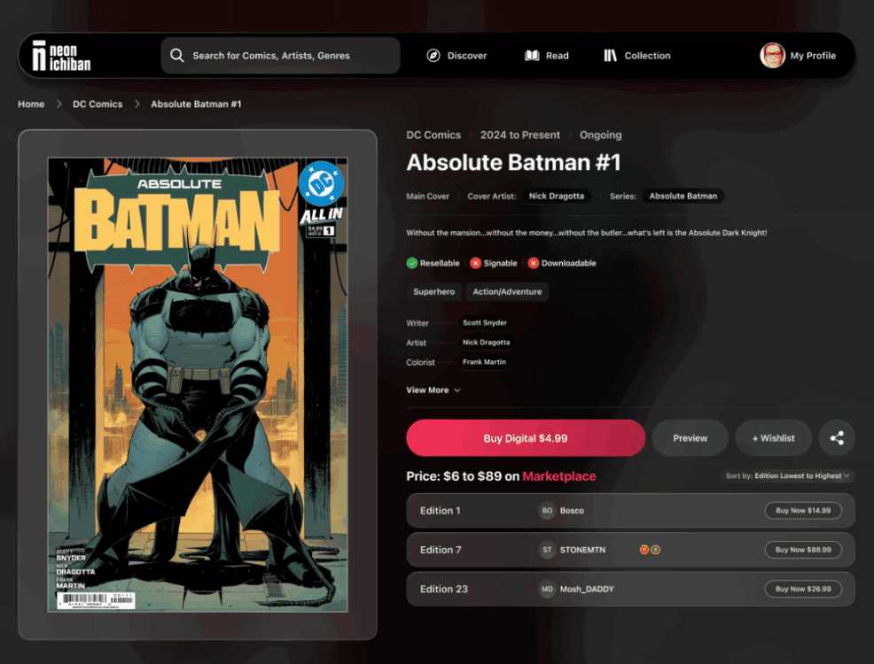 NEON ICHIBAN is the next evolution in digital comics and manga—a future-forward platform where fans don’t just read, they can buy, sell, collect, and connect. Founded by Comixology veterans David Steinberger and Chip Mosher, NEON ICHIBAN delivers unprecedented digital control, direct access to creators, and a resellable
