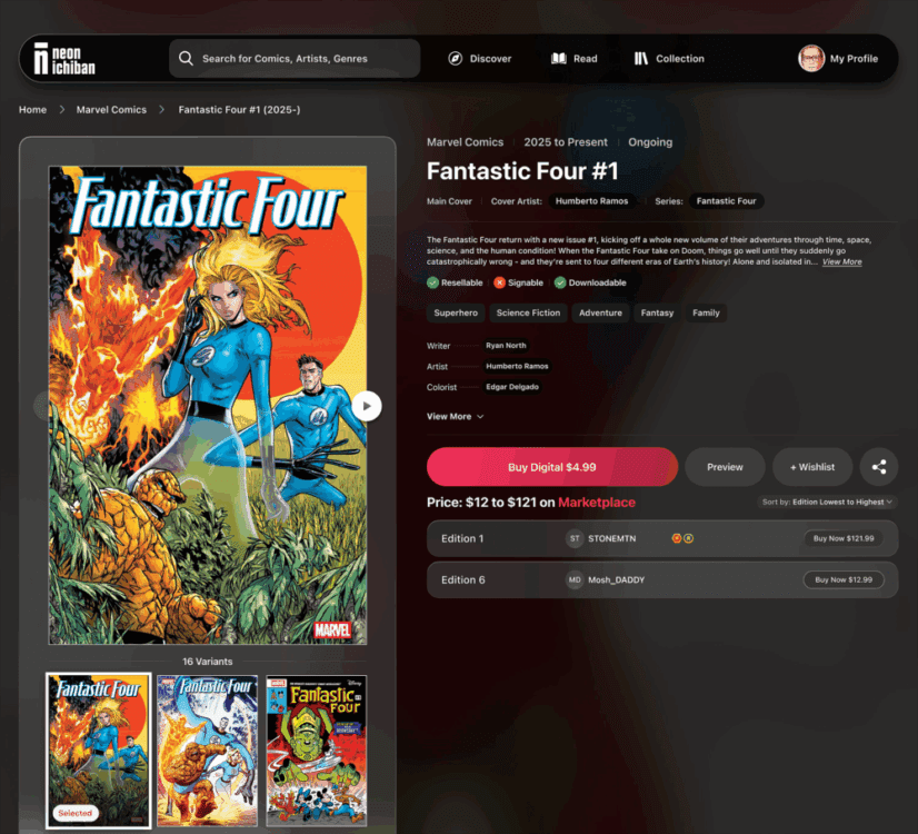 – All-In-One Digital Platform: NEON ICHIBAN serves readers and collectors simultaneously, offering same-day-as-print comics, manga, collections, and graphic novels. Single issues come in always-available standard editions alongside limited-edition variants and sketch covers for collecting.