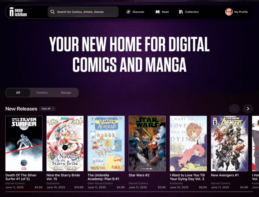 LOS ANGELES, CA / NEW YORK, NY — June 19th , 2025 — NEON ICHIBAN, a new visionary digital comics and manga platform, was announced today by industry pioneers and Comixology veterans David Steinberger and Chip Mosher. Designed to transform how fans, creators, and publishers connect on a unified platform, NEON ICHIBAN sets a bold new standard for discovering, buying, reading, and collecting digital comics