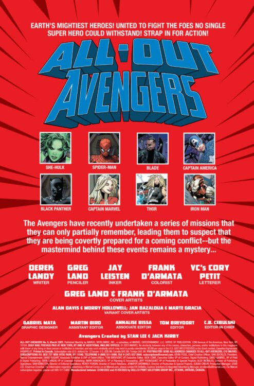 The issue is by writer Derek Landy and penciller Greg Land, with inks by Jay Leisten, colors by Frank D’Armata, and letters by Cory Petit. The main cover is by Land and D’Armata.