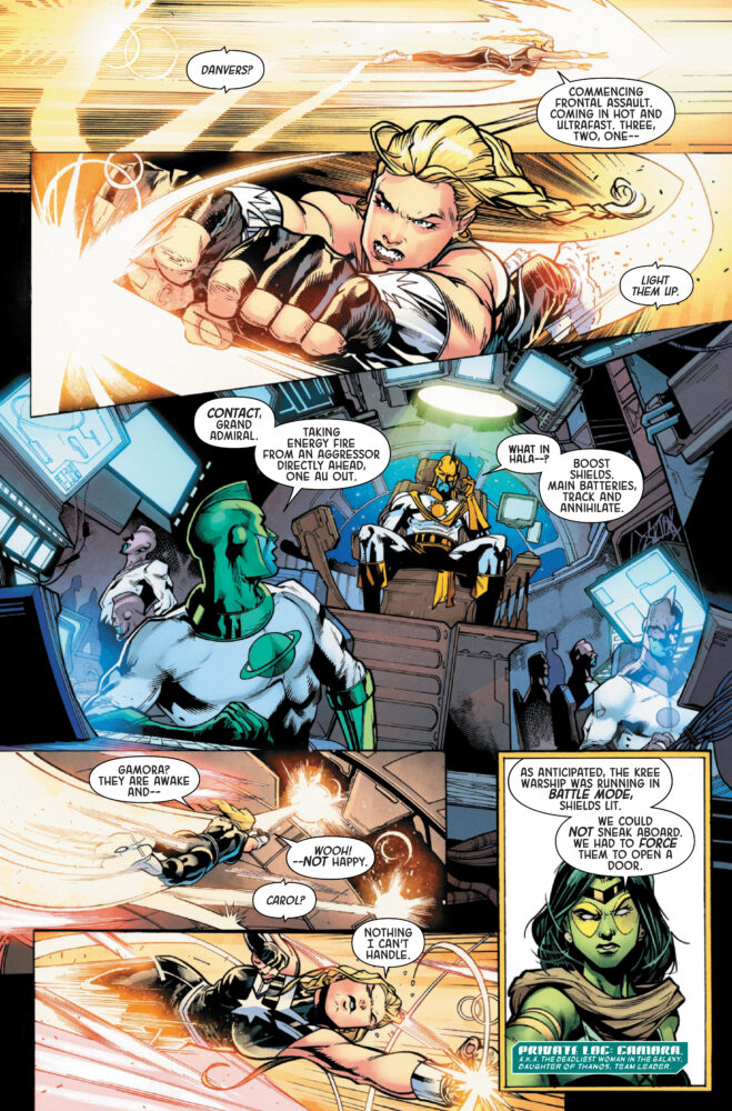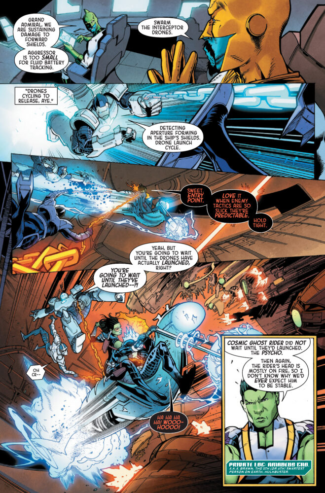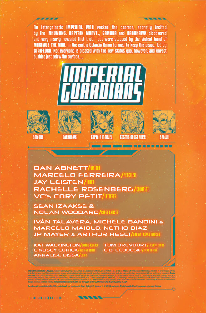 Gamora, Captain Marvel, Amadeus Cho, Darkhawk, Cosmic Ghost Rider! Five unlikely operatives recruited by Maximus of the Inhumans. Their mission? Protect the delicate balance of new Galactic Union by ANY means necessary…and failure is NOT an option. Expendable, deniable and disavowed, they are the Imperial Guardians. But can they do Maximus’ dirty work and keep their consciences clean? Why has a Kree Grand Admiral gone rogue and attacked Hala? What’s going on with Darkhawk’s mind? What deluded fool thought COSMIC GHOST RIDER was a team player? And, most importantly…what kind of game is Maximus REALLY playing?