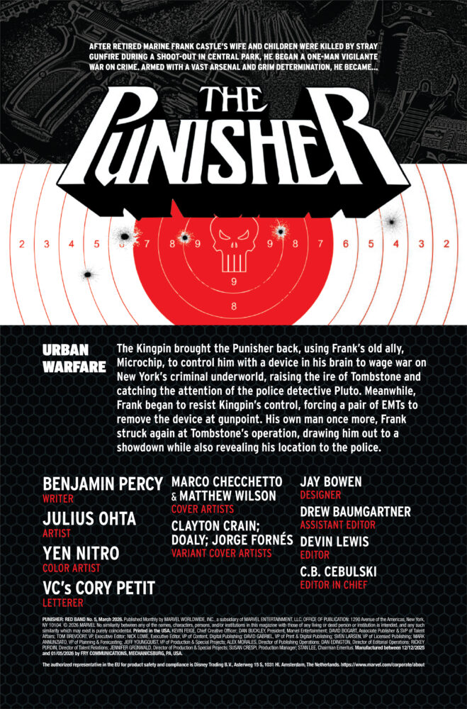 Frank Castle’s return to the Marvel Universe is cemented at last, as virtuosos of violence BENJAMIN PERCY and JULIUS OHTA’s symphony of slaughter reaches its killer crescendo!