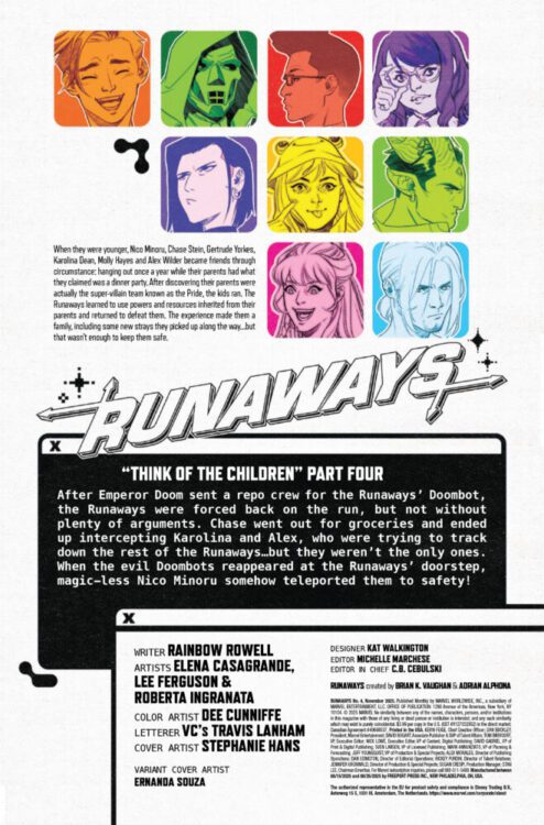 Have Gert’s training lessons with a self-doubting Nico finally paid off? Is her power reclaimed? Will Karolina and her unlikely allies be able to find Nico and the rest of the Runaways before a much larger threat does? And has Doombot finally embraced the Will of Doom and turned on his family?!
