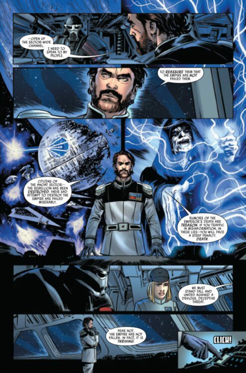 A DEFIANT IMPERIAL takes center stage – and goes on the offensive against the NEW REPUBLIC! LEIA makes a startling discovery in the forests of ENDOR! Who are the mysterious and deadly ACOLYTES OF THE BEYOND?! What is the new villain’s connection to DARTH VADER? All this as the post-Return of the Jedi storytelling BEGINS!