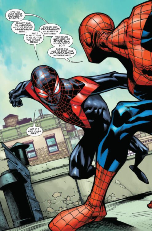 SPECTACULAR SPIDER-MEN #5 hits your local comic book store on July 17th, but thanks to Marvel Comics, Monkeys Fighting Robots has an exclusive three-page preview for you!