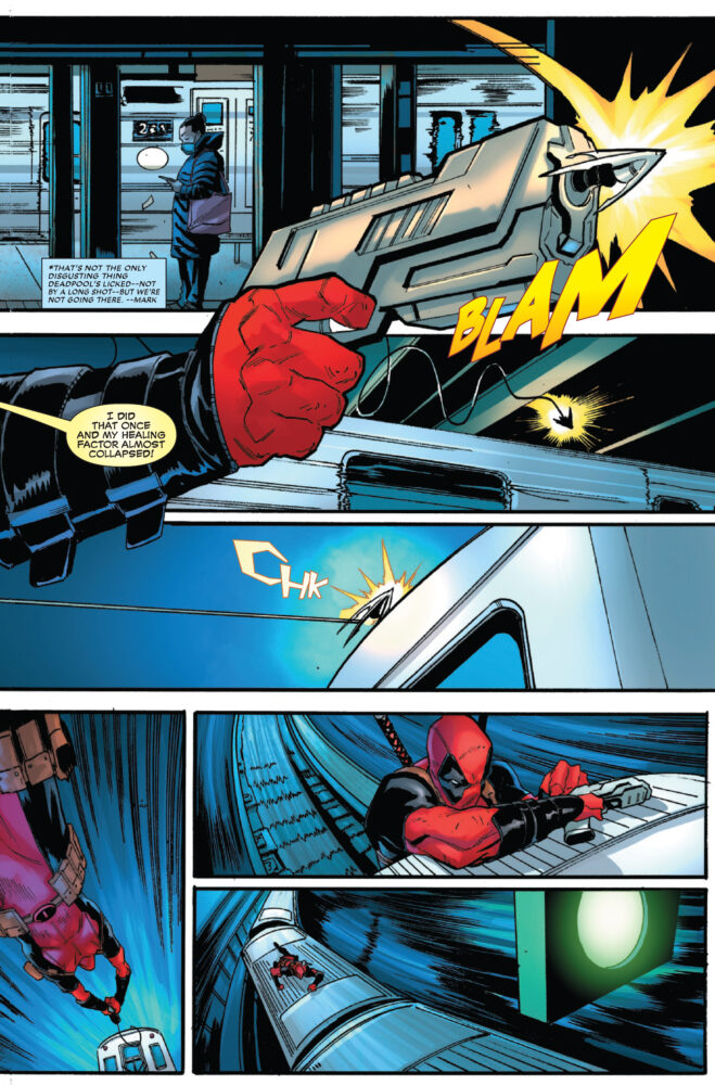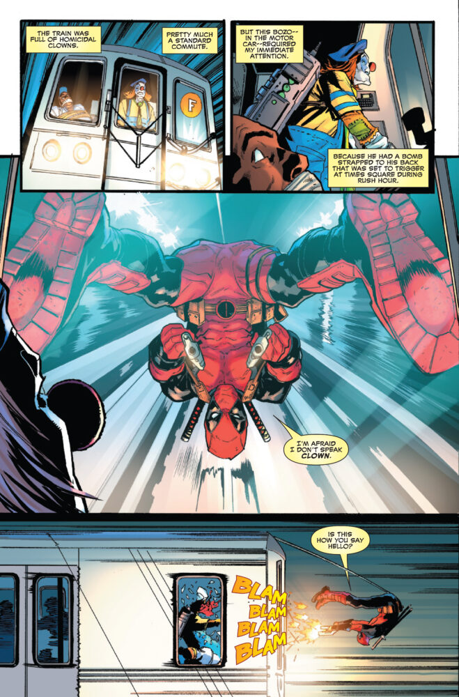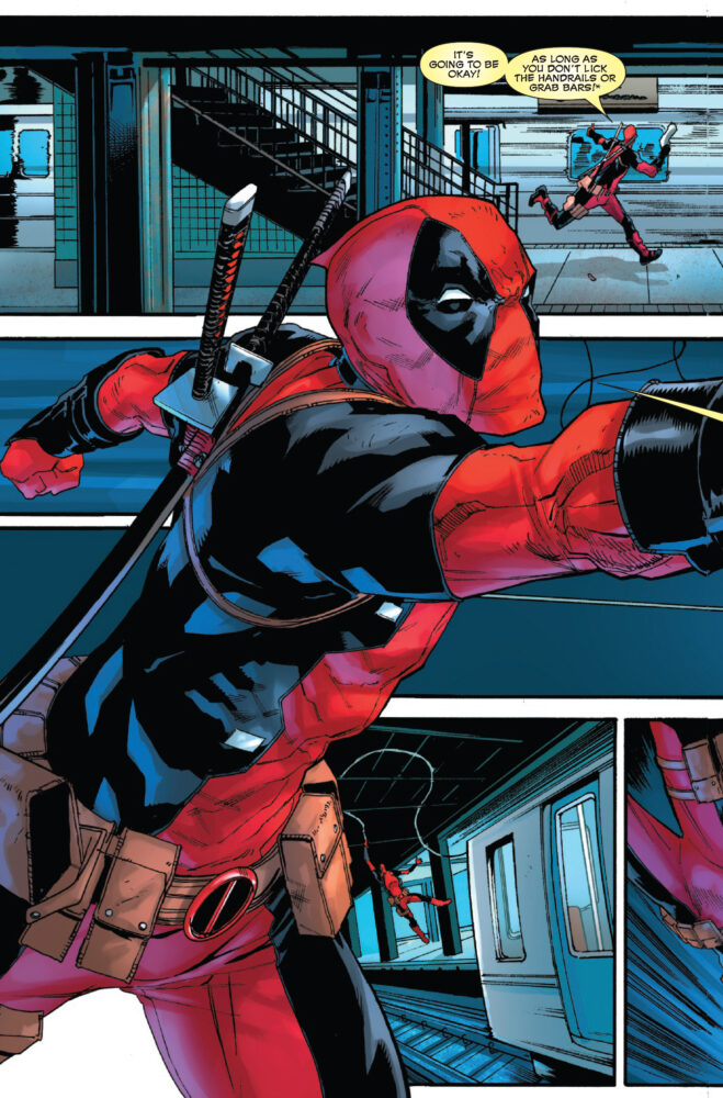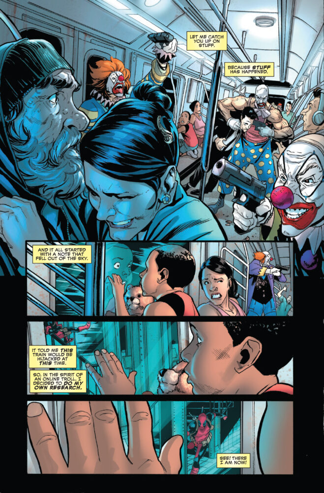 A deadly subway caper shows DEADPOOL the truth: The secret message he received was right! And with intel on crimes before they are committed, Wade Wilson has no choice but to do the right thing: exploit his insider knowledge for PROFIT and COLD HARD CASH! Merc’s gotta merc! But can he outrun the horrible pain of his tragic mistake, or is this all setting Wade up for the worst fall of his life?