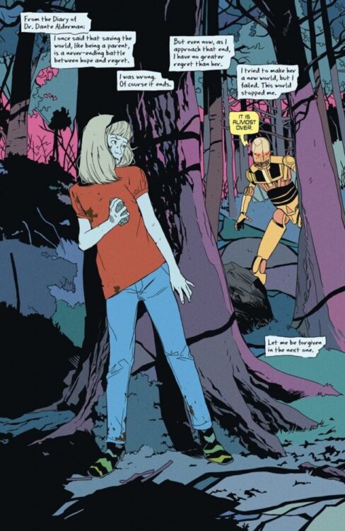 MR: In 2020 Stefano and I were supposed to do a series at Marvel, but the pandemic hit and everyone was told pencils down and the book was paused. When things were unpaused we were no longer on the book that we had been so excited about. So Stefano actually approached me about us doing a creator-owned book together and I was really into the idea. He sent me some drawings of this robot character that he’d been playing around with and I just fell in love with the design. From there I built a whole world for the robot to live in. Some of it was born at that moment, some of it is stuff that’s been in my head for years. I tend to really focus on a few themes and dig deep into them, and sometimes that spills over into the next book. So in some ways this book is in conversation with my other titles We Can Never Go Home, 4 Kids Walk Into A Bank, and What’s The Furthest Place From Here?. They aren’t literally connected but I think there is a thematic throughline as I reassess things I’ve said, if that makes sense.