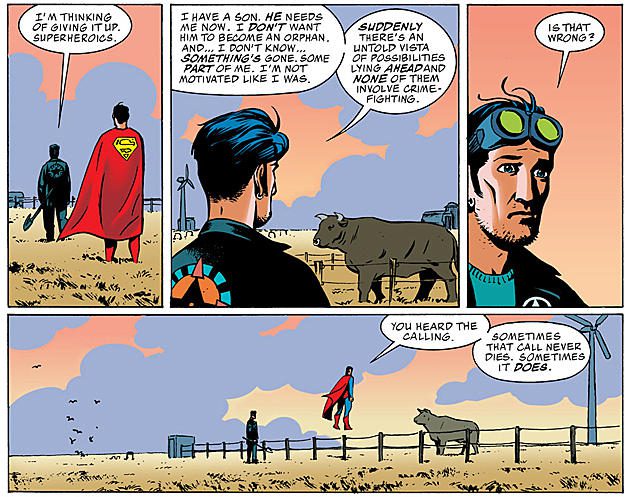 Joan breaks the fourth wall, too. Or at least, she almost does. King and Charretier have her looking off the page in shock. Is she looking at us? You can’t help but picture Buddy Baker’s peyote trip in Morrison’s Animal Man. And King also has his own version of Morrison’s continuity aliens – a relationship counselor and a relentless cowboy. But there’s one thing that separates Joan from Buddy. The moment Buddy Baker figures out he’s in some kind of story, he spends every second trying to find a way out. Joan Peterson is different.