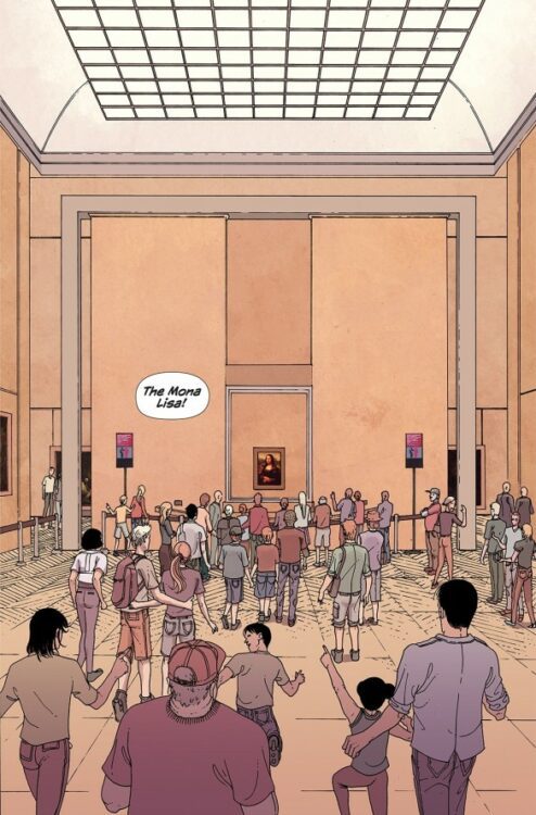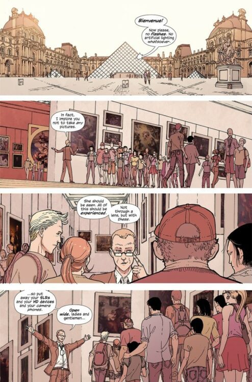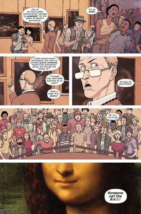 Art Brut #1’s biggest draw for many is likely to be the unmistakable style of Martin Morazzo’s pencils. Before Ice Cream Man became a modern classic, Morazzo honed his unique sense of animation and character design in this eccentric indie comic. For those who may be worried that because Brut is an older comic the quality may not be quite up to snuff, have no fear. Morazzo’s work here looks as though this could be an Ice Cream Man follow-up instead of its predecessor. His signature style may be divisive to some, in a similar way Frank Quietly’s work is – after all, their penciling approach is alike. However, for those in tune with how unique this comic is and can accept an out of the ordinary art style, Morazzo’s work here is an absolute treat. His work here is perfectly complimented by the colors of Mat Lopes. The color artist behind The Dreaming and Ka-Zar brings his dynamic and dreamlike visual approach to this weird take on art itself and does so with a spectacular finish. Every panel smacks the reader in the face with vivid colorwork, and Lopes nails the transitions from the “normal” world to the weird artistic world with a smooth yet jarring finish. His work makes the pages seem like they could be reached into, much like the paintings Art and Manny investigate. Visually, Art Brut is an even more stunning achievement than Ice Cream Man, and captures this strange world of artistic conspiracy brilliantly.
