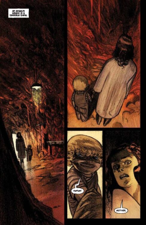 While Doyle’s script pulls us in to this fascinating story, it’s Lisandro Estherren’s haunting visual work that makes Be Not Afraid #1 such a haunting story. The Redneck artist’s unique approach to character design and direction makes every sequence in this issue feel memorable. His heavily shaded lines and sort of forced-perspective shots give certain characters a sort of uneasy sense whenever we see them on the page – and this goes especially for the cursed buy the story mostly follows. Few silhouettes bring the sense of unease that the wide-brim hat preacher outfit does in this comic, and Estherren really utilizes that design. The alien appearance of a presence that – at least in certain more traditional circles – is supposed to bring comfort just adds to the subversive feeling of horror this comic offers. Every panel in Be Not Afraid feels at best like a liminal space of unease, and at worst like a blood-filled nightmare. Estherren’s pencils are some of the most suited for the horror genre in contemporary comics. His work here is brought to life by Francesco Segala’s color art, which imbues every page with a gloomy and unsettling color palette that blends in perfectly with Estherren’s chaotic line work. Every page looks as though it has a haze of dust and corrosion over the scenery, adding to the foreboding sense we get from the characters. Simon Bowland’s lettering adds a clever sense of readability to the experience as well, using his distinct style and reflexive dialogue-work in the absence of any SFX letters. Overall, Be Not Afraid is off to a brilliantly unsettling start in the visual storytelling department.
