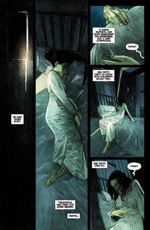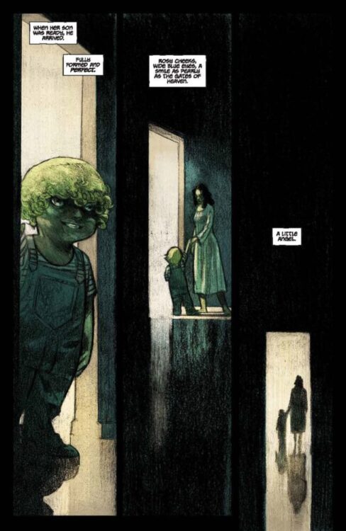 Jude Doyle drops us into a tale of tense dread and woe right at the start of Be Not Afraid #1. In a work of grim religious horror, he turns the notion of immaculate conception on its head by producing a child straight from hell. Every sequence with this child is deeply uncomfortable, increasingly so as we spend more time with him and discover his effect on the world around him. The small town this boy and his mother live in is cursed, and that terror seeps in to every page. Doyle’s careful choices with how he progresses the story increases the tension in the comic due to how little we know as we begin. There’s little by way of exposition, but we put together the larger truth of the story by the interactions between characters and specifically how the boy affects the world and people around him. The result of this storytelling approach makes every moment feel surprising and disturbing. Thematically, horror stories regarding religion and the subversion of childbirth have always been deeply unsettling depending on how they’re told – and this one is off to a fantastic start. I can’t wait to see Doyle’s overall plans with the rest of this series.