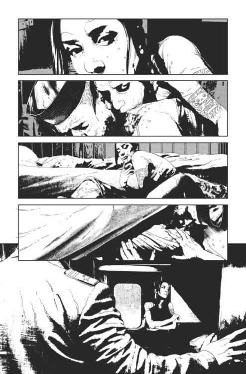 There are pages where the layouts work more in line with the narrative and still challenge the standard grid format. One such page consists of a single image spread across two pages, with panels picked out using thin white borders. The panels simulate the passage of time across the picture, as the narrative follows a character making her way through the landscape. It helps to show the desperation and hopelessness of the character’s journey because the landscape is all consuming; the single image demonstrates how the woman’s presence doesn’t affect the landscape. It is unchanged by her journey and her ultimate fate. There are other pages that have similarly eye-catching layouts, with some working better than others.