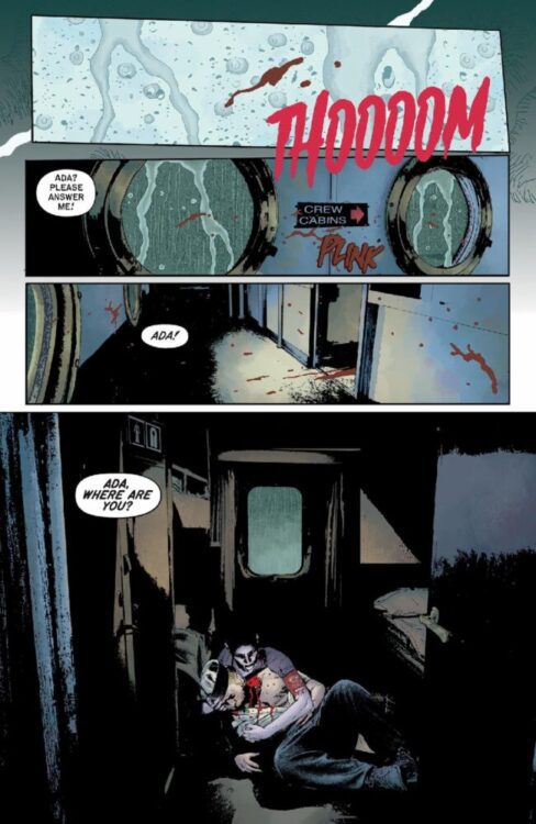 The story is actually a continuation of an entry written by Bechko and illustrated by Jonathan Case for issue three of Epitaphs from the Abyss. In that short, the feisty central character Ada runs from a screaming mob and stows away on a luxury yacht that is hit by a terrible storm. Over the course of five days, stranded on a lifeboat in the middle of the ocean, the survivors keep themselves alive by drinking each other’s blood. Ada is the one to suggest this course of action because her survival is paramount to her and, in the very first panel of the story, she is introduced as a blood sucking vampire.