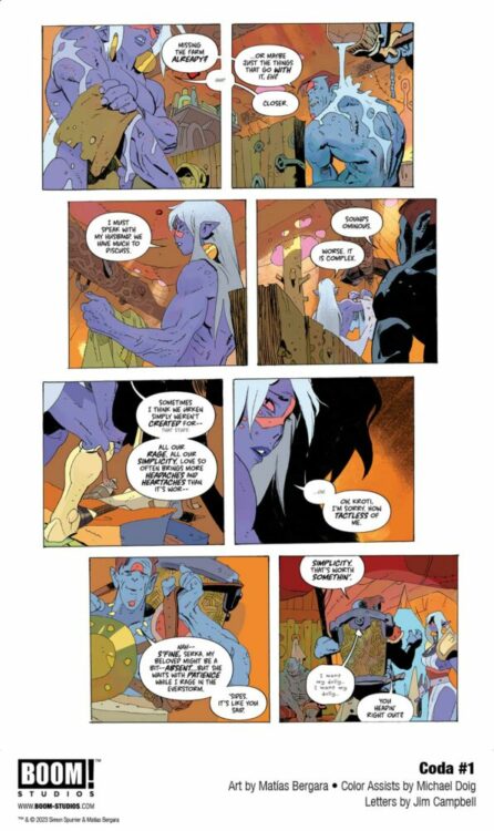 Si Spurrier drops readers new and old head first back into the world he and Bergara created in Coda #1. Taking place some years after the original series ended, Hum and Serka are living their lives keeping to their ways – with Hum preferring a quiet life away from others, Serka needing to take trips as a warrior in service of others. Naturally, things get complicated, and the pair are exposed to new, rising elements in a reality that is still reeling from the events of the last series. Spurrier does a great job setting this issue up for both newcomers and fans of the original series. The events of the last story are referenced from time to time, but there’s never a point where a newcomer may feel lost. Spurrier focuses his efforts on the here and now of this sequel series, and with the problems that have started to crop up. As with most of Spurrier’s work, much of this comic’s reading experience is tied to overhead narration that digs out the thoughts of the main character. The grumpy, sharp delivery in these boxes fits Hum’s personality very well, while also feeling like it’s the writer speaking to the audience. These blurbs do make the read more on the dense side, but they add tremendous personality to the script. Spurrier’s clever humor always lands with a mix of absurdity and the unexpected. Hum and Serka’s two very different experiences each have their own weirdness and increasing complications – complications that closely align with elements of our own world. Spurrier’s sometimes hilarious and sometimes deeply insightful dialogue gives all of his characters distinct personality while adding thematic weight to the story. Overall, this follow-up series is off to a brilliant start in terms of its unique storytelling sensibilities.