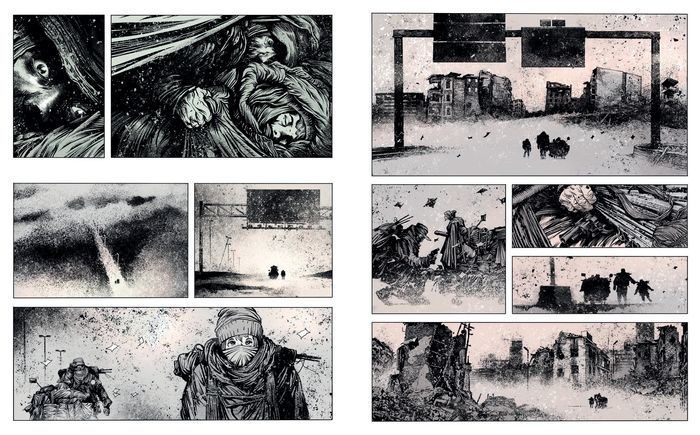 The real star here is, of course, Manu Larcenet’s incredible visual work. The ash covered, dilapidated vistas and landscapes of rotting steel craft a nightmare vision interpretation of McCarthy’s The Road. While John Hillcoat’s 2009 film adaptation does a solid job of visually interpreting McCarthy’s work, it doesn’t come close to what Larcenet is able to do with his pencils and inks. There’s a dark beauty in the utter destruction and decay Larcenet presents McCarthy’s descriptions in, with everything from the great steel of construction cranes, to crumbling skyscrapers, and even old advertisements casting a constant, frightening reminder of the world that once was. A real treat here in Larcenet’s adaptation is his interpretation of the two main characters – the old man and his son. Both characters spend most of their time wrapped in layers of clothing, their faces hidden under hats and obscured by ash. When we are shown their faces, the facial detail and animation does incredible work in showing how tired and almost beaten they are – but how they also still retain their humanity. Small moments of joy still find their way into the story; going for a swim, finding an unexpected stockpile of supplies, or even just the discussion of a hopeful future, shows readers that humanity still exists in this shell of a world. Much of this adaptation, and of the original work as well, is a true horror story. The depictions of violence inhumanity in this story are chilling and genuinely vile. Larcenet captures the brutality of this future with grotesque, shocking artistry. There are panels I will likely never unsee, in keeping with one of The Road’s constant motifs. Manu Larcenet’s work here is astonishing, showing an understanding of McCarthy’s writing that allows for tiny glimmers of hope under the devastation and terror this story has to offer.
