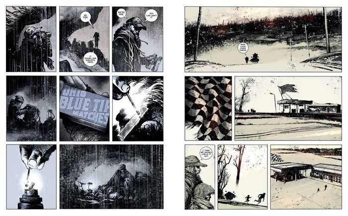 Cormac McCarthy’s prose in his post-apocalyptic novel The Road feels almost tailor-made for the comics medium. Manu Larcenet takes the original author’s vivid descriptions of a burned world and paints them to life with tremendous detail and careful consideration. McCarthy’s novel uses very little dialogue. Most of the original The Road is made up of lengthy descriptions of what the two main characters see and interact with in this burned-out world. What dialogue is there actually breaks the conventional rules of writing – McCarthy never uses quotes for character speech. Larcenet manages to take McCarthy’s approach to prose and repurpose it on every panel. What little dialogue there is sticks out and stays memorable due entirely to its context within a sequence, and Larcenet’s placement on the page. The actual dialogue is flat and standard, like the speech of a normal person – which is why it works so well in context. With his interpretation of the original work’s dialogue and writing style, Larcenet shows that he understands what makes The Road and McCarthy’s own writing style special.
