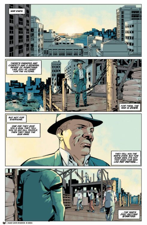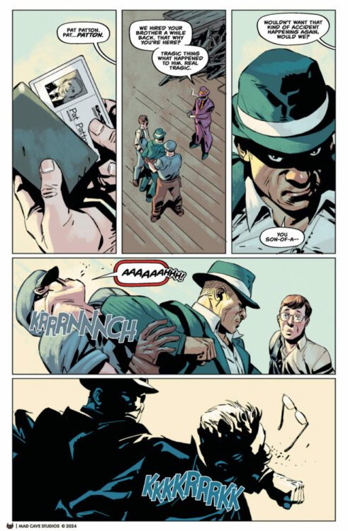 In issue two, the plot begins to thicken as Dick Tracy continues to investigate the murder of Emil Trueheart at The Green Eye with the assistance of the victims daughter, Tess. Their main lead, Mumbles, isn’t saying very much (that they can understand), but he clearly knows something. Meanwhile, Pat Patton is searching for the truth about what happened to his brother on a seedy rebuilding project and comes face to face with someone he knows to be a traitor to the country.