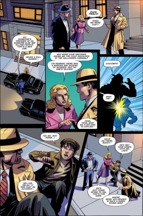 The opening sequence of this comic highlights the writers’ approach to the Dick Tracy series as a whole. They have taken elements from the history of the character, from across mediums, and merged them with a contemporary ethos to retell stories that have been told many times before, but with a new and often surprising twist. The confrontation between the Kid, Steve, and Tracy is the entrance story for Junior Tracy into the detective’s world, and has been in numerous iterations. In this version, the initial fight is reminiscent of the 1990 Warren Beatty movie version, but the writers give the ending of the sequences a kick that, despite the title of this comic, you might not see coming.