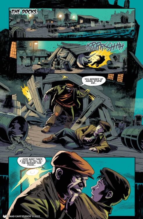 Opening on the docks at night, the story starts with the violence that has become synonymous with Dick Tracy: the Kid is getting slapped around by Steve the Tramp over the younger one’s inability to con money from their chosen marks. The fight escalates but is soon joined by a third person: the titular detective. Or is it?