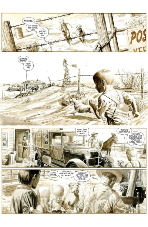 So much of Dust to Dust #1’s tone and pacing is due to J.G. Jones’ impeccable visual direction. His sepia pencils immediately place readers in the Oklahoma dust bowl of the 1930’s while channeling an aura of black and white Hollywood films. Jones’s direction feels reminiscent of a John Ford and Howard Hawks film, with his characters similarly drawing from the likes of Robert Mitchum and Lauren Bacall. His character animation here is a wonder in itself, with his detail looking as though they were stills from an old movie at times. The environmental art of the Oklahoma farm town, as well as the desolate land surrounding it, drive home this issue’s thematic core and conflict. Anyone who has read a J.G. Jones comic won’t be surprised at how stunning the visual work here is, but even so it may be some of the best in the artist’s career. Jones’s focus in this first chapter is building a cast of characters, and the sequential direction drives this home. Every sequence of interaction is expertly plotted and carefully paced to make sure each conversation – and observation – lands with memorable effect. The most effective bit in the comic, both visually and narratively, is the Sheriff occasionally pulling out and inspecting an “artifact” given to him in the book’s opening. Jones builds a sense of curiosity, then dread an unease, as the issue continues and it becomes readily apparent what the item actually is. The lettering (couldn’t find credits, unsure if it’s also by Jones or another talent) fits in beautifully with the rest of the visuals. The rough hand-drawn font conveys the dialogue’s tone, while the sand-worn SFX letters almost hide in the background as they craft diegetic noise. Overall, Dust to Dust is off to an incredible start in terms of visual direction.