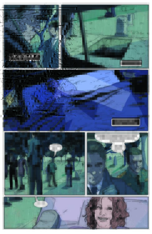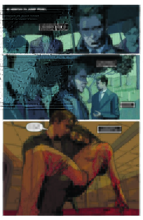 One of the reasons why the movie is so compelling is due to the superb visuals orchestrated by cinematographer Adrian Biddle. Artist Tristan Jones has been able to mimic the cinematic style while maintaining a distinctively comic book feel. His artwork is grainy and he uses a combination of fine lines and chunky black areas to define the shapes on the page. The characters emerge from the backgrounds thanks to the subtle colouring by Pip Martin who shifts the tones slightly in the panels to distinguish between character and object. This works especially well in the long shots where Martin’s colours create layers out of Jones’ inks, with the characters sitting on top of the backgrounds.