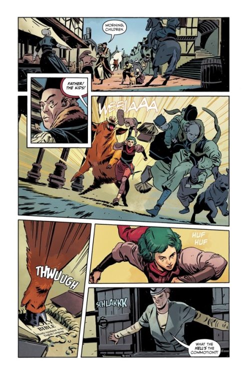 Gospel #1 cements its fictional identity with Morris’s clever historical fantasy style. A masterful work of tone, this comic stays on the serious side with its subject matter, but is somehow also immensely fun. The reformation of the Catholic church under Henry VIII was, as we could gather, a historically turbulent and brutal time. However, with this period being so long past and with the fantasy possibilities tied to post-renaissance storytelling, Morris jumps at the opportunity to create something both joyfully endearing and insightful. The core plot is relatively simple: Matilde is a parish defender of the faith trying to do good deeds and earn a reputation as a sort of religious hero. Her problem is that, with all this upheaval and chaos in the wake of the Church’s reforming, it’s very difficult to find anything of note to even do. This is where Pitt the storyteller comes in, as he agrees to embellish tales of her heroics. Of course, the inner details of the characters’ lives — as well as the appearance of a possibly truly formidable foe — add complications to the plot that will no doubt make this story all the more intriguing as it continues.