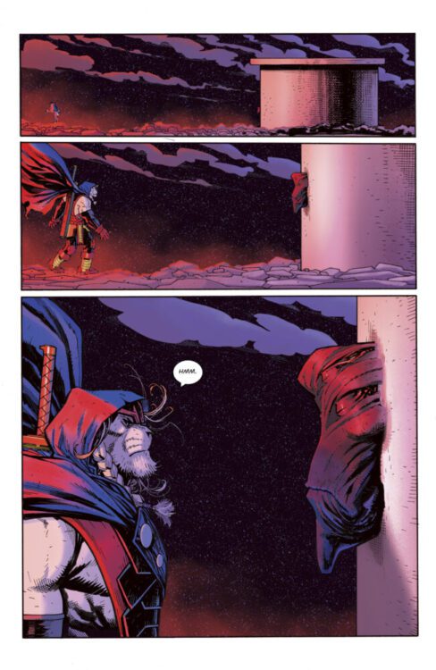 This first issue wastes no time reminding readers that the Battle Beast name, much like Conquest’s, is a title—one given to a being who lives solely for the thrill of combat, and who desperately seeks defeat. As we follow the start of his journey, we see glimpses into his origin, becoming the savior of his homeworld due to his immense strength, and then having to abandon said world to save it from himself. This characterization of Battle Beast is very in line with what has already been established. He is not just a mindless brute rampaging through the universe; he’s an intelligent brute rampaging through the universe.