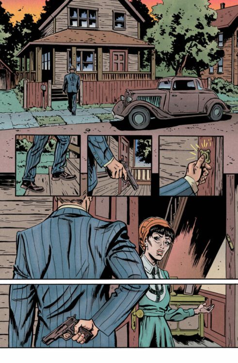 Not yet convinced? Maybe color is your thing. If so, award winning colorist Ellie Wright delivers exactly what you are looking for. There are some clear color transitions between the present and the flashbacks, with the latter taking on a sepia tone befitting a 1930s gangster tale. The present day element has some brighter, almost vivid, colors, however these still fit the era the story is set in. Nothing is too modern, too artificial. Most of the vibrancy comes from the natural world—the distinctive greens of the trees or the vivid orange sky.