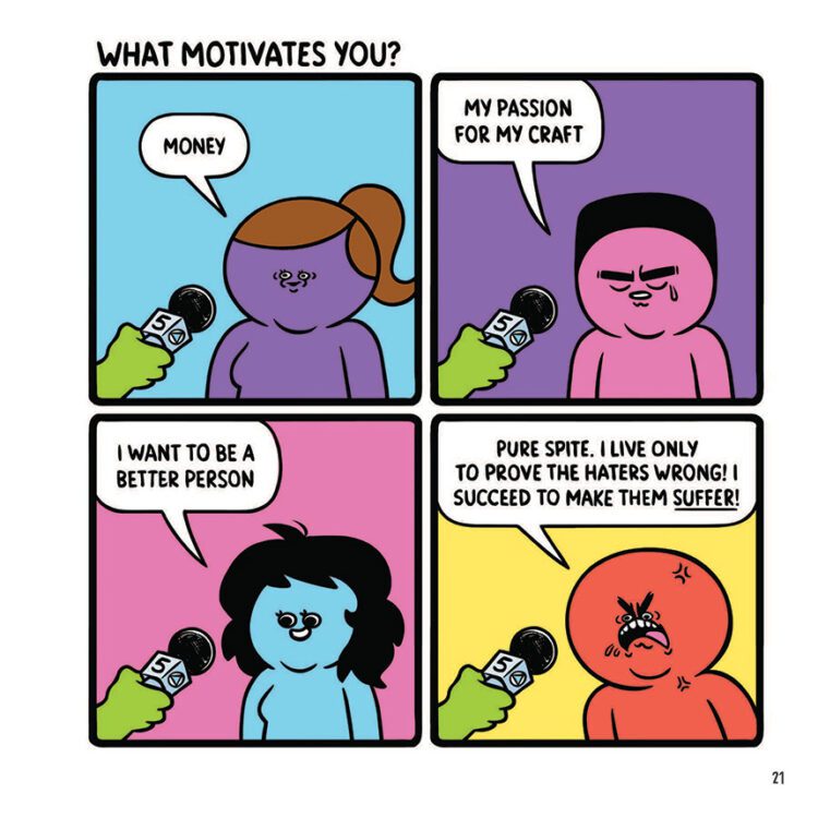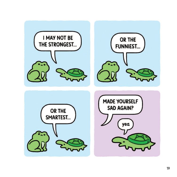 While the book is by no means meant to be sad, it can tackle some difficult feelings, and this is when Westover’s over-the-top, near-caricaturistic style shines. The characters are generally just funny to look at, and in many examples, juxtapose the emotion being portrayed, and some panels are full visual gags with no written punchline. Westover also has perfected the art of making his characters cute and endearing, making it difficult to not build an instant connection to them. While the art is objectively simple, there is a clear eye for detail (or lack thereof) which Westover expertly chooses to accentuate whenever funniest.