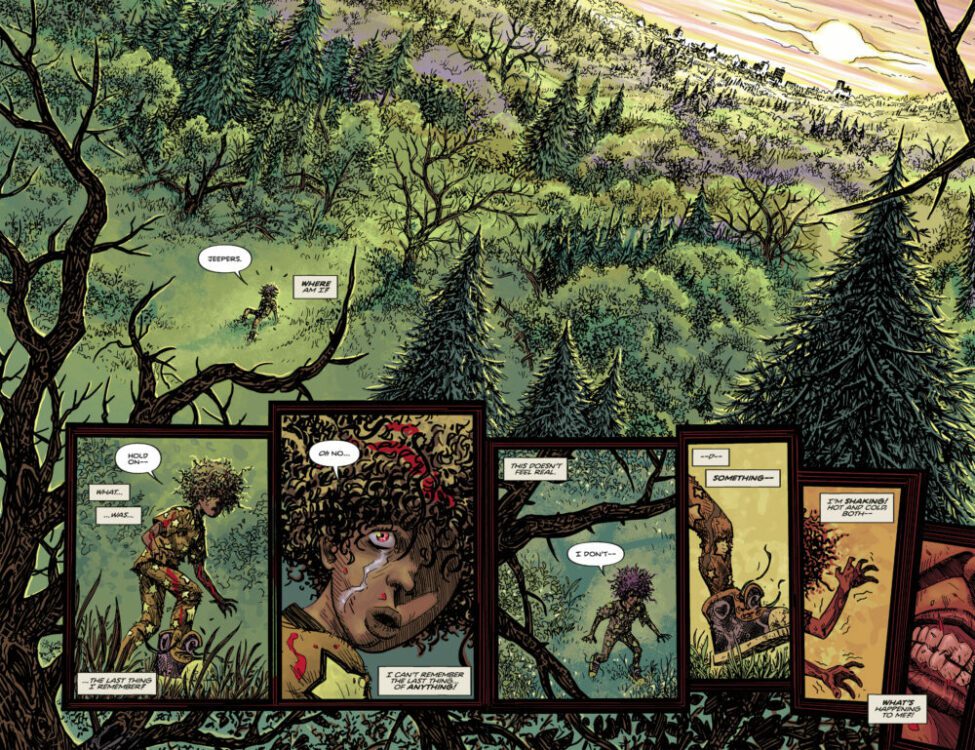 The lettering from Campbell also showcases the characters well. Two specific highlights would be the inner monologue from ‘Patra, which mimics a scared child, with lots of short sentences, often filling the page with small incomplete thoughts she is having. This contrasts the secondary narrator, who is an educated, calm man, whose inner monologue and exposition fills large chunks of expository yet concise thoughts. The voices always feel clear and personal.