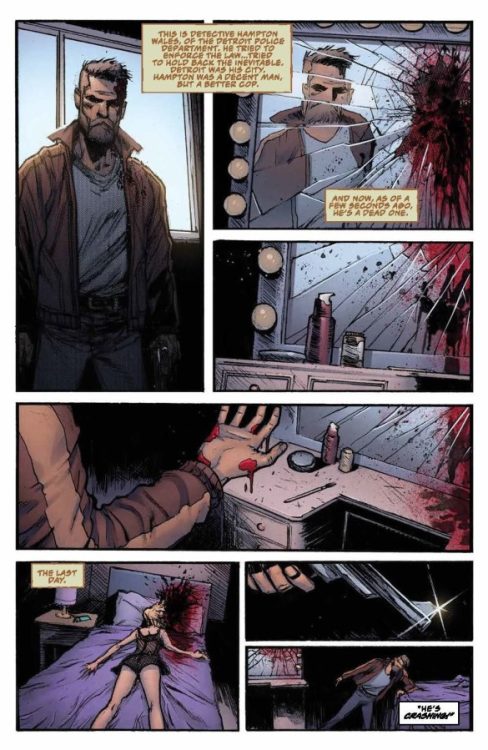 Revolvers #1 starts its story off as a formulaic R-rated detective story before diving more into its supernatural plotline. For the first two-thirds of the issue we follow depressed detective Hampton Wales as he recounts his day to a prostitute (he’s married, by the way). He’s gotten a man killed, his partner is bloodthirsty and corrupt, everyone on the force is on the take, etc. The majority of this comic is ripped right out of a 70’s or 80’s grindhouse police movie, and if you’re way into that then great! However, it’s so familiar that it would be easy to lose interest in the story before the comic reached its horror-style focus. Once the comic gets gory and starts dealing with the occult, it becomes a much more engaging read. The notion of a cursed, unnatural firearm isn’t new either, but it’s a cool enough plot device that, alongside the rest of the comic’s events leading up to Wales receiving the revolver, the end of the book makes up for much of the book’s prior flaws. The dialogue is a bit on the cornball side, and it honestly works perfectly for the book. As comic book plots go, this is a pretty safe bet for an Image book – especially for fans of the grindhouse-style edge of 90’s Image.