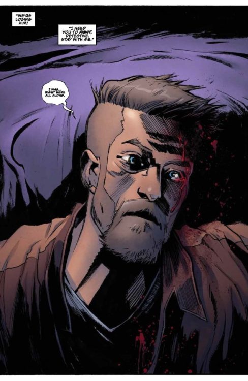 The dark city streets and nightmare underworld visions of Revolvers #1 are brought to life by artist Christian Dibari. His hatching-heavy, angular designs craft the exact aesthetic this comic deserves. Every panel is bathed in shadow, thanks to how Dibari shades surfaces and characters. There is a lot of effort put into making this vision of Detroit as run-down and crime-ridden as possible, and the art really does a great job of selling that oppressive and violent atmosphere. Character designs are pretty bog-standard, but that isn’t really important in a book like this. Where Dibari really gets to shine is with the bloody landscapes and twisted flesh when the supernatural stuff materializes. From freshly skinned bodies to towering spires of gore and eyes, Dibari does a stellar job of creating striking scenes that feel like something out of a video game. His sequencing is solid as well, with careful shot choices and panel variation carrying the reading experience along at a steady pace. Simon Gough’s colors do a solid job of cementing the book’s gritty aesthetic with a dark, almost muddy color aesthetic. Because of the book’s setting and overall vibe, he doesn’t have much to work with outside of blacks, browns, and reds, but it’s still impressive work that works in service of the story. Overall, Revolvers has the exact sort of visual experience this brutal, grimy, 90’s style throwback needs.