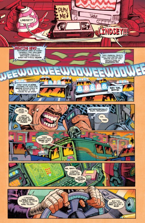 If you could somehow impose an audio volume onto a printed page, RoboWolf would be loud. It’s got popping neon colors with every single page, keeping with the 90s theme. The opening pages are reminiscent of an arcade machine opening sequence, where you find out what the story is before you can pound bad guys. The colors are hardly ever muted, and the pages are often riddled with oranges and reds, showing the hilariously obvious reference that they reside in ‘Sunset’ Hills. Though these colors make it extremely easy to track characters on screen and follow the impressive amount of detail on every panel.