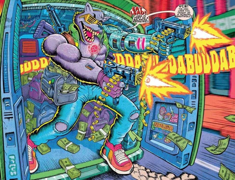 The characters are all designed very in theme with the comic, and each one feels like they were plucked straight from a Teenage Mutant Ninja Turtles writing room floor. This is not to say they don’t feel unique in their own ways, but rather to compliment how well these brand-new characters feel so familiar immediately upon appearing. There’s obviously heavy influence and spoofing happening here, but RoboWolf never allows it to be hacky or uninspired. One stand-out to me in this comic was the lettering, which really brought all of the elements of the comic together. The lettering seems to invade the page at times, it’s so overtly drawn and large, with ridiculous sounds like “ka-shatter,” “buddabuddabudda,” and “shrasplort” that really accentuate the action, but also allow even the most gruesome scene to feel irreverent and funny.