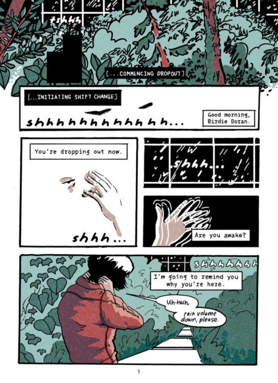 This opening sequence establishes Birdie’s relationship with the setting, and Anderson delays giving the reader a good look at the character until the scene has been set. Her artwork is very deliberate with sturdy lines that create shapes for the colouring to define. There is an ironic distinction between the machines that Birdie interacts with and the natural elements that fill the background of many panels. The manufactured elements are comprised of clean cut straight lines, coloured white or grey. The human elements, such as clothing, is more brightly coloured, and the natural world is less defined, with lines indicating the boundaries of the plants. But the colour does most of the heavy work, shaping the landscape that fits around Birdie and the machines. Complicating this neat separation of the manufactured and the natural is the AI interface. On the one hand, it’s clearly artificial, as signified by its ghostly colouring and ability to switch form at will, but the forms it takes are of creatures you might expect to find in the natural world depicted in the opening pages. This mix of natural and artificial acts as a link between the characters and their environment, a link which becomes more and more important to the narrative as the comic unfolds and Birdie’s world is turned upside down.