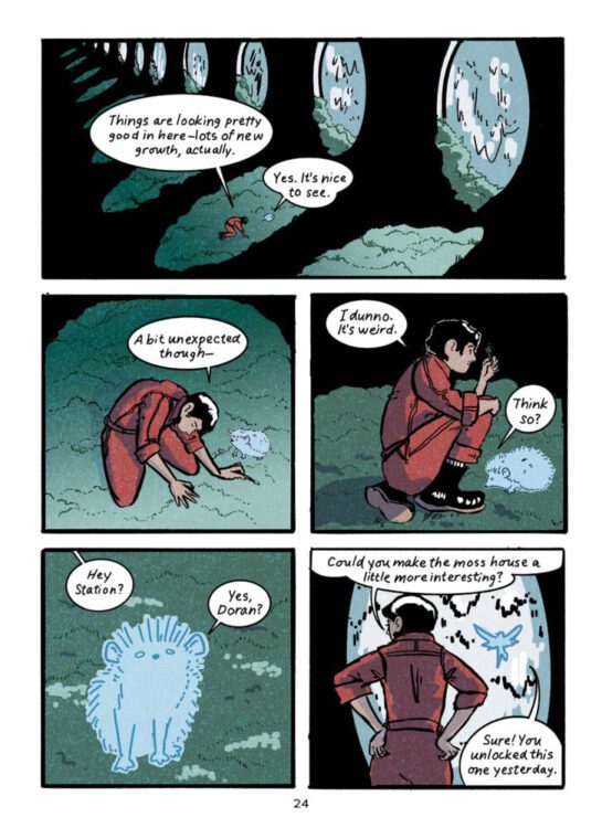 Second Shift begins with the central character, Birdie Doran, being woken up by the station’s AI in a sequence that is a mix of a system reboot and flashes of memory. This moment is a juxtaposition of science and nature, with the text representing the background code of a computer system while the images show a slowly emerging natural world. Anderson then uses this awakening to introduce the reader to the character and setting, allowing both character and audience to acclimatise to the situation together. This technique is a tried and tested science fiction trope that allows creators to drop an audience into any fantastic world and control the culture shock that is inevitable. You just need to see the introduction of the Nostromo crew in Ridley Scott’s Alien, or Jinn and Phyllis’ holiday cruise in Pierre Boulle’s novella La Planète des singes, to see how effective this kind of introduction can be. In Second Shift, Kit Anderson effortlessly introduces Birdie Doran, the station where she lives and works, and the few other characters that she interacts with, most notably the constantly form-shifting AI interface referred to simply as Station.