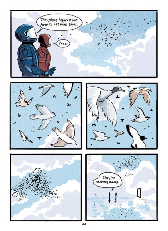 For a story so deeply tied to the control and reliance of Artificial Intelligence, the opening is surprisingly emotional, as it focuses heavily on the relationship between Birdie and Heck. An ongoing conversation between the two characters stretches over several pages, highlighting the difference of opinion between the two and their connection to Station. Anderson focuses the reader’s attention beautifully on this conversation, gently emphasising elements of the speech by subtly changing the background colour. Throughout much of this sequence, the unreality of the comics form is manipulated to enhance the speech and character acting. Heck’s posture speaks volumes, while Birdie’s gestures and quirky smiles enable Anderson to show how Heck’s words begin to get beneath Birdie’s skin. The backgrounds disappear, leaving panels empty of props and distractions, allowing narrative focus and character development to take place.