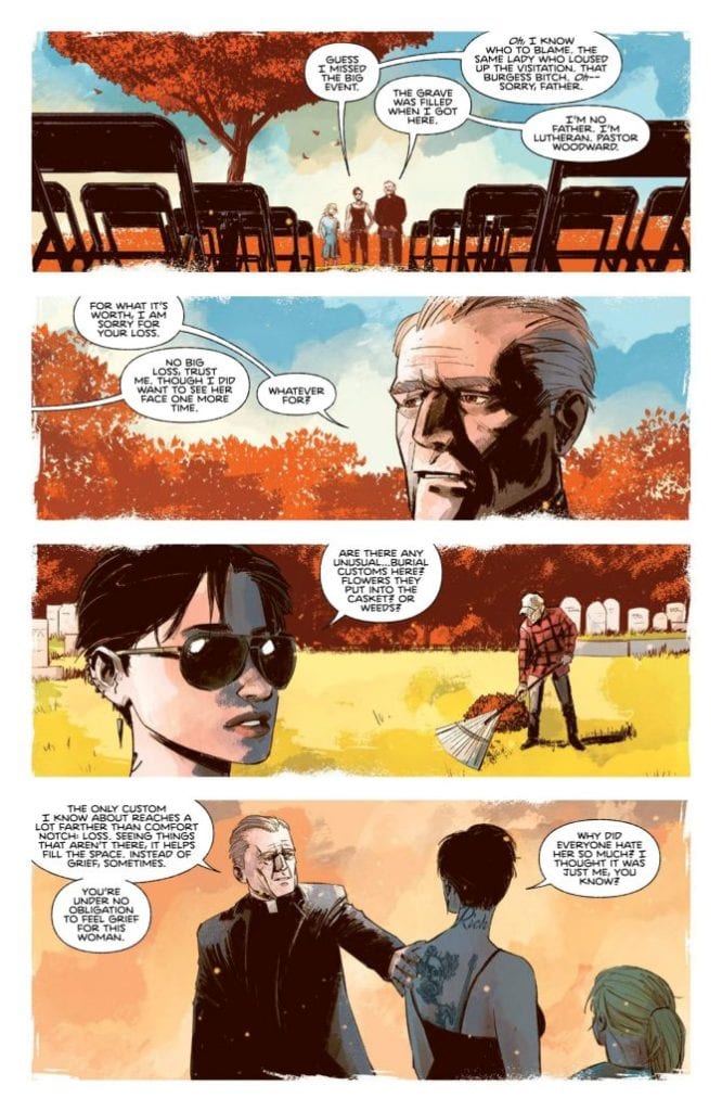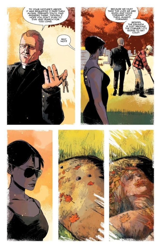 That oppressive atmosphere that “The Autumnal” #2 carries that I mentioned earlier is mostly the product of Chris Shehan and Jason Wordie. Shehan’s pencils bring out the humanity in every character that appears on panel, but especially succeeds in humanizing Kat and Sybil. His sense of panel direction also offers up a couple of great false scares that do occur in this issue, and they don’t come across as cheap. This comic frames the two protagonists as being alone in uncharted waters, both in terms of the town and strange circumstances of Kat’s mother’s death (and life, for that matter). Shehan constantly paints a focus just on these two characters, going to great lengths to make everything else seem strange and alien. The atmosphere is largely cultivated by Jason Wordie’s colors, who makes this comic feel like a haunted vision of its titular season. Every page looks like a cool autumn evening, but with an almost inexplicable dash of something not quite right in the air. How this effect is achieved in a comic is astounding on its own. The lettering from Jim Campbell is a classical and refined style, which still uses enough variation in its font to sell the tone of whichever character is speaking. From the visual angle, this comic is brilliant in terms of both fidelity and atmosphere.