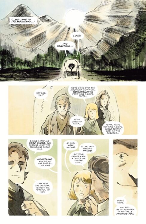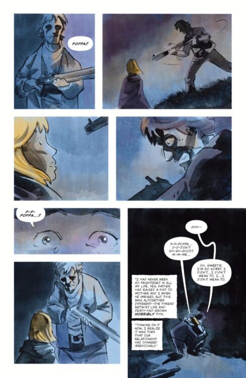Before I continue, I have missed something crucial: the cover. If the opening scene sets up a classical western, then the cover screams traumatising horror. The blood red streaks painted across the full width of the cover with two wide, horrified eyes is unnerving enough, but then the ghostly face carved out of the central “A” like a jack-o-lantern ready for Halloween sends a shiver down your spine. To flip from cover to first page and back again is to create an unnerving contrast of both narrative and theme. Just like the movies Bone Tomahawk and High Plains Drifter, The Goddamn Tragedy is one thing disguised as another: It is a horror disguised as a western. There are glimpses in the first few pages, beyond the cover, that give you a clue, and as Ellen begins to tell her story, the narrative doubles down on laying the groundwork for the impending horror. But before you get there, writer Chris Condon and artist Shawn Kuruneru are going to embed you in the Janson family’s life.