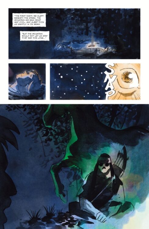 The first few pages of Ellen’s story are open and bright, with Kuruneru using very pale colour washes for the background, meaning that they almost blend with the gutters on the page. The lack of bold panel frames is more at home in a memoir comic, where true events unfold, and that lends itself perfectly to this comic. The setup challenges the contrast between truth and fiction. Rapp’s original story was a lie, we are told by Ellen, but we have not seen or heard any of it. We are then given the true story with no frame of reference, but instinctively a narrative is created in our minds. The concept of legends and western myths isn’t new to us, the audience, so when the character in this story insists on telling us the truth, we conjure up this wild, outrageous horror story and prepare for any supernatural elements to be explained. But Chris Condon is smarter than that. The tables are turned and we are presented with a western comic closer in style to Stanley Kubrick’s The Shining. There is an open dissertation on the traumas of family life, and the relationship between Ellen, her mother, and her father is explored, warts and all. There is even an element of survivor’s guilt from Ellen, and this is explored as well through the telling of her tale. Those beautifully painted setup pages pull you so deeply into the lives of the Janson family that their trauma becomes yours. Even as you fight against the decisions that are made by several characters, there is no way you can change their fate, unless you close the comic and stop reading. Suddenly you have become the scream queen running up the stairs instead of out the front door.