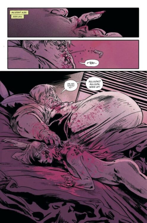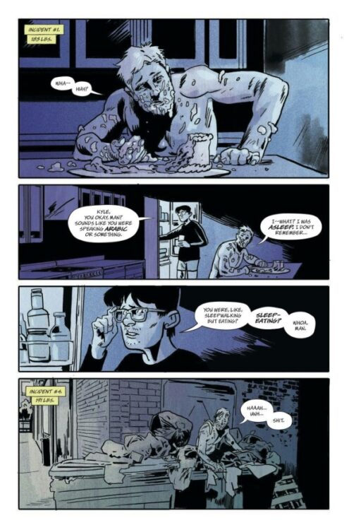 Sabir Pirzada takes readers along on a journey of twisted Middle Eastern mythology and ancient anger with his script for The Sacred Damned #1. A rising young football star begins to have some strange bouts of sleepwalking – and sleep eating. His problems become worse and worse until Inayah Jibril, an occult specialist a la John Constantine, arrives to help him with his case. Pirzada’s script feels like a mix of The Twilight Zone and a classic Tales From the Crypt story. There’s a kind of twisted humor to what happens to the young athlete that will definitely be a hit among fans of that sort of ironic, gallows humor/horror. The dialogue and interactions around what is happening are also kind of stilted in an intentionally peculiar way, with no one reacting to the athlete’s actions and bodily changes in any kind of sensible manner. The issue feels like a sort of uncanny nightmare until Jibril comes in. Structurally, this comic plays out like any other possession story seen or read since Blatty/Friedkin’s The Exorcist. This doesn’t keep Sacred Damned from being any less fun, however. While the final pages of the issue are bogged down a bit by backstory exposition, the script as a whole is a satisfying possession romp that deserves the chance to breathe with a proper long-form series.