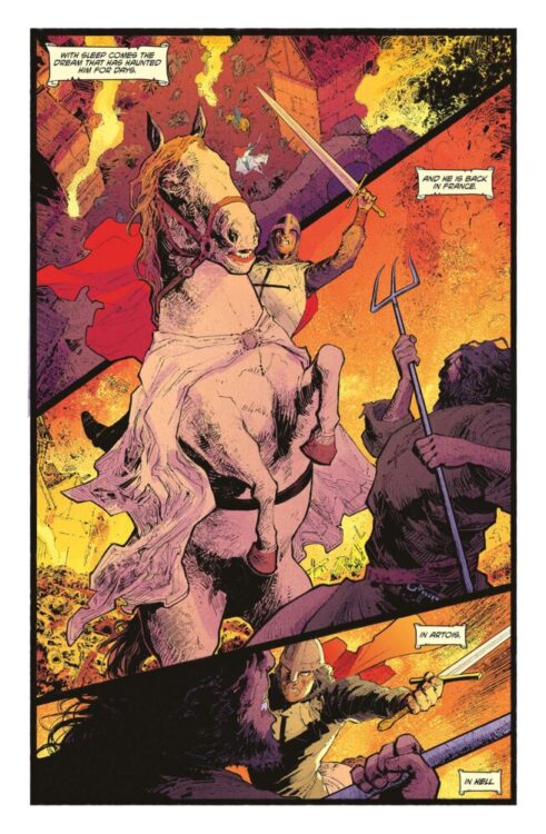 Peter Milligan transports readers to a time in history filled with blood and pestilence in The Pale Knight #1. Sir Hugh de Grey, a particularly skilled English knight, is coming home from a vicious campaign across Europe slaughtering the Church’s enemies. As time has passed and he’s watched more of the land fall prey to a brutal plague, doubt and regret have sprouted in place of duty and faith. This begins his journey home to his wife and son – as well as an unexpected visitor. Milligan takes his time introducing the characters and state of the world within the pages of this comic. The script feels more drawn out than most comics, with a considerable amount of time spent on Grey’s dialogue with those around him. This allows readers to very easily get inside the knight’s head, and it lets Milligan sort of isolate the character from the world around him – especially since most other characters in the story are right bastards. Every conversation and inner thought feels important, and the atmosphere of the story begins to feel desperate and pained – all said as a positive. The Enigma writer retains all of the deliberate story craft and wit that he’s always had, and this book does feel like something that would have been released back in Vertigo’s heyday. Without getting into spoilers (if you could consider the appearance of a character on the cover a spoiler), a certain character’s manner of speech ends up being a delightful little subversion of expectation. If you’re familiar with Warren Ellis’s treatment of Death in Netflix’s Castlevania series, expect something similar. Overall, Milligan pens a tonally rich and intensely sharp opening chapter for The Pale Knight.