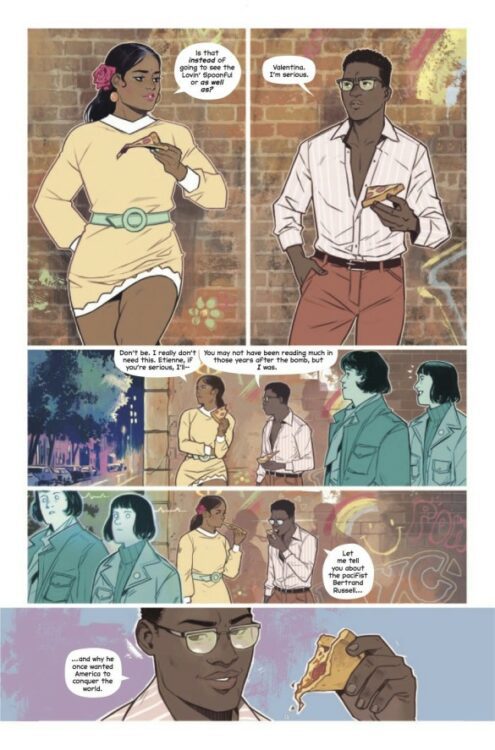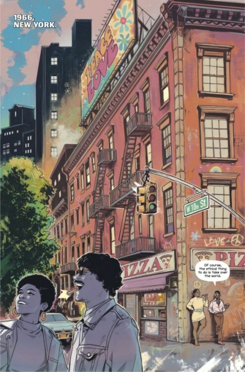 Caspar Wijngaard’s stunning animations, vibrant colors, and tightly plotted sequential direction make Power Fantasy #1 a reading experience that is as perfectly paced as it is stunning. His character designs are wonderfully unique, with each of the Six superbeings offering wildly different aesthetics – from Lux’s impeccable modern fits to the Destiny-inspired android design of Magus. Wijngaard’s eye for facial animation keeps the many conversations as engaging to watch as they are to actually read, maintaining a sense of humanity in these beyond-human characters. His panel structure is wildly diverse, with completely different arrangements on every page based on the flow of conversation. Wijngaard makes it a point to illustrate every subtle change in expression to gauge the tone of a conversation, then breaks that conversation up with his sequential direction. Once more, action in this comic is seldom, but when it hits it absolutely pierces the reading experience. Wijngaard saves his splash pages for the absolutely biggest moments, making them explode off the page and remain memorable after you’re finished reading. Wijngaard’s color art is as equally stunning as his pencils, offering an experience that could only be captured in the comics medium. His pastel-style art washes every page in warm, colorful hues and creates an almost liquid across every panel. His work makes every panel feel almost like they’re spilling over into another, despite the fact that they are all separated by pretty conventional blocking. There’s a distinct effect Caspar deploys contrasting the Superpowered and the normal passersby – the main cast receives a complex, defined color palette, while the extras are all in washed-out monotone. It’s rare that color art helps define a comic’s theme, but Power Fantasy is proving itself to be an exceptional comic. Case and point is Clayton Cowles’ lettering. I’m not sure when the last time was that I saw a comic use lower-case lettering in dialogue balloons. Here, it makes the wordy reading experience feel more like prose – without ever letting go of being a visually-engaging comic. The Power Fantasy is a striking tour de force of visual storytelling.