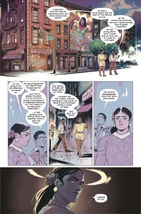 Writer Kieron Gillen (The Wicked + The Divine, Eternals) is no stranger to writing being with unimaginable power. From Marvel’s most famous to reimagining the gods of myth, Gillen has always had a knack for portraying for portraying superbeings with incisive introspection. His work here in The Power Fantasy #1 is taking this entire concept to new heights. Equal parts Watchmen, The Authority, and the work of Jonathan Hickman, Power Fantasy presents us with a world that is run entirely on the whim of 6 sentient nuclear warheads – you know, superheroes. Most of this comic is run on Gillen’s gripping conversational dialogue. He pens exposition that introduces this reader to this world while declaring the weight of what is currently happening in said world, all while making it not feel like exposition at all. Characters talk a *lot* here, but every word is important. You’ll find no snarky one-liners here, everything is as serious as a declaration of war – which it may as well be. Every interaction has tremendous weight, which makes sense when we’re watching walking nuclear arsenals negotiate. Action is rare in Power Fantasy. However, when it does happen, it happens carefully and with frightening implications. There’s only one action scene in this issue, and the entire final third of the comic is spent watching the painstaking work it takes to keep events from spiraling into apocalypse. This is a fascinating comic, and is easily some of Kieron Gillen’s most impressive work in a storied career.