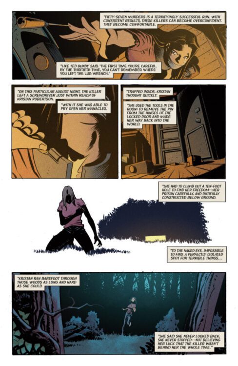 Kyle Starks has always had a way with injecting wild subject matter with his own brand of humor, and he keeps his streak alive with Those Not Afraid #1. The issue starts off with what I could only imagine was the main inspiration for this comic – a true crime podcast. Stark’s script details a gruesome survivor story while setting up the main crux of the plot – the state record for kills from a single killer. When our two new serial killer protagonists meet, the game is on. Starks’s writing here is just as compelling as it is charming. He builds tension through the tense dialogue that the supporting characters share about the murders, while setting up a sense of uncanny irony with the lead killer. Mark, our main focus in this issue, is written with such a great sense of phony suburban charm you can’t help but like him. His happy-go-lucky dialogue being so juxtaposed with his rival – and the entire premise of the comic – is a fantastic character choice. Starks sort of shocks the reader into laughing, with how casual and oddly fun he makes the book’s events feel. The final page twist is delightful, and makes the wait for issue #2 a hard one.