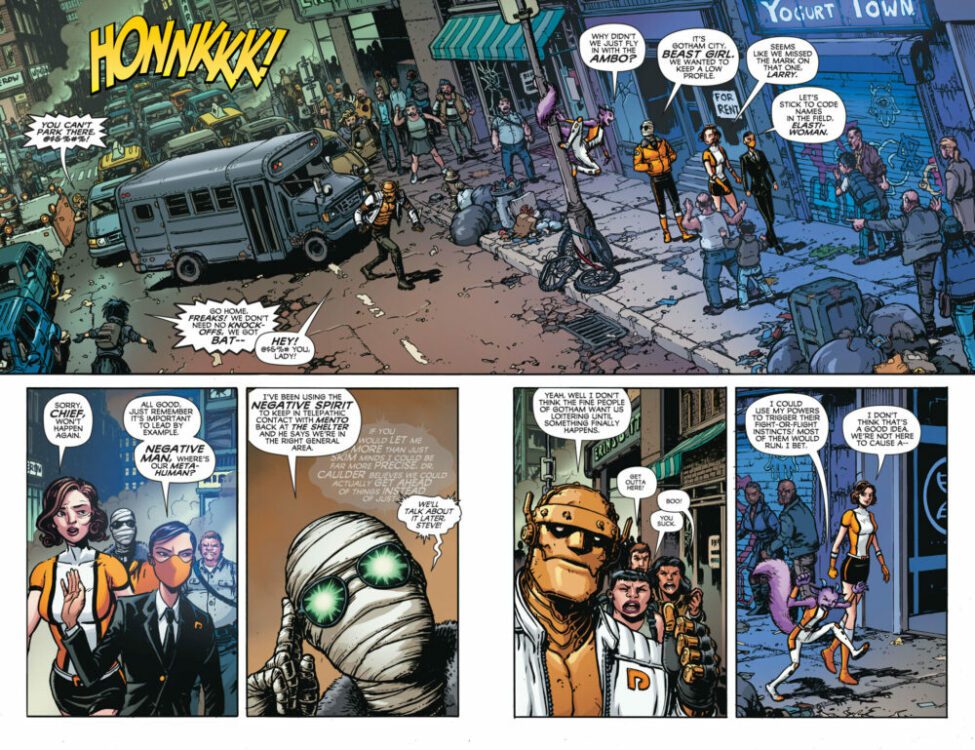 “After the events of Lazarus Planet, more people than ever have active metagenes! Most of these new metahumans have become misfits, shunned and imprisoned by a fearful society. They are hidden away in the dark, lost to a system that only sees them as weapons or guinea pigs-ticking time bombs that can only be defused by the Unstoppable Doom Patrol! Robotman, Elasti-Woman, and Negative Man are joined by their brand-new teammates Beast Girl and Degenerate and led by Crazy Jane’s mysterious new alter, the Chief, on a mission of saving the world by saving the monsters!”