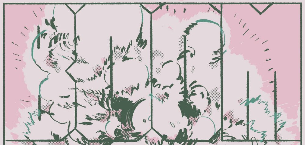 As for the colors, Van Der Knapp manages to get a lot of mileage out of shades of blue and pink. Pink dominates each page, and blue saved for highlighting the outlines of each character. Though it also shows up in finer details like the readout on a scope or outlining details in a dark room. Pink may not be the first color many would choose for a post-apocalypse, but the bright shade overwhelming each page conveys its own bleak tone. Especially in a desert wasteland where the sun’s constantly beating down.